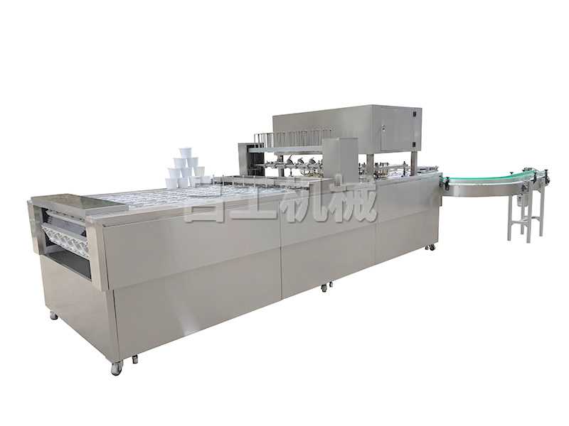 本機采用合理的機械傳動,功能齊全,灌裝、封口、切邊、制品推出,廢料收卷,印碼等自動化工作,可節約人力,降低成本。本機有二次熱封裝置,料杯/碗/盒與封膜經過前后二次熱封,封口牢固可靠。
