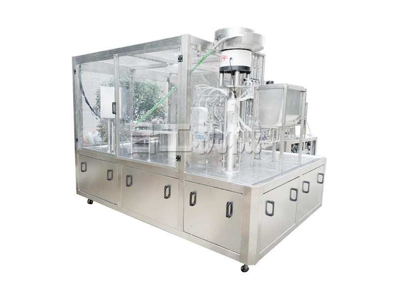 特點(diǎn):本機(jī)從自動定位—自動吹氣—自動定量兩次灌裝—自動清洗—自動下蓋—自動旋蓋—自動出袋
